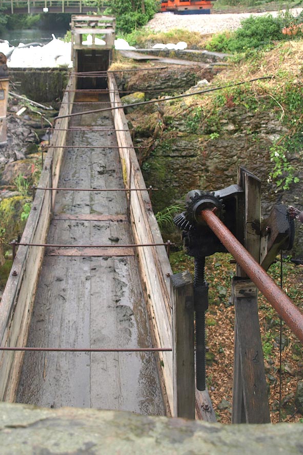 Sluice gate and mill lade supplying water from the mill dam to the mill wheel.