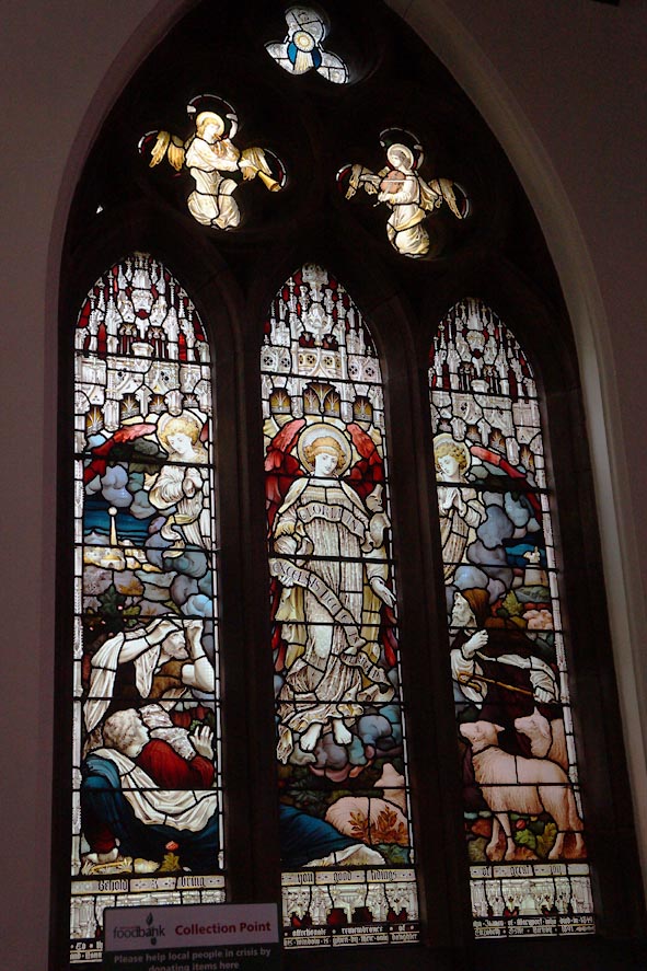 Stained glass; angel appearing to the shepherds, by Heaton, Butler and Bayne, 1891.