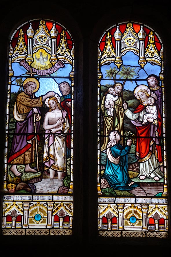 Stained glass; Baptism of Christ, Christ with little children, by Wailes and Strang, about 1887.