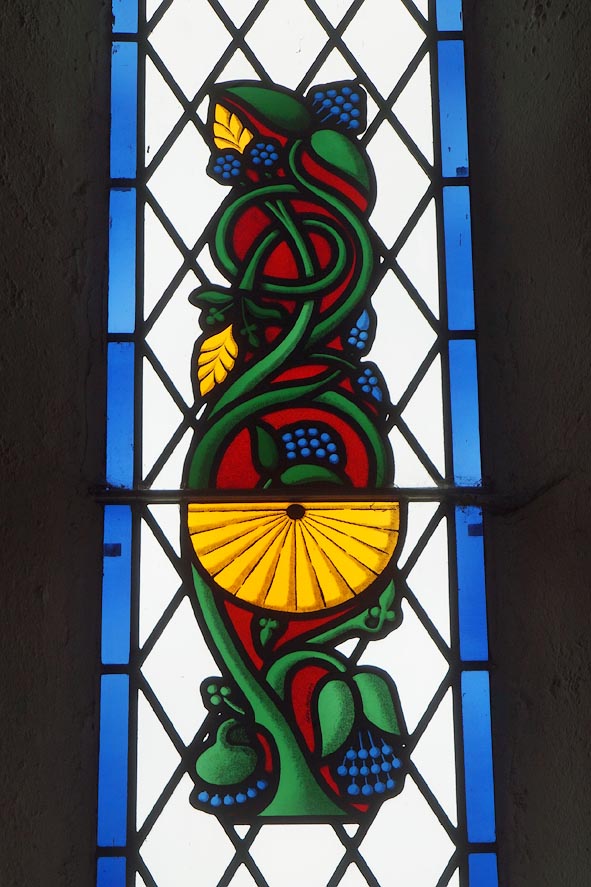 Stained glass; foliage and a scratch dial.