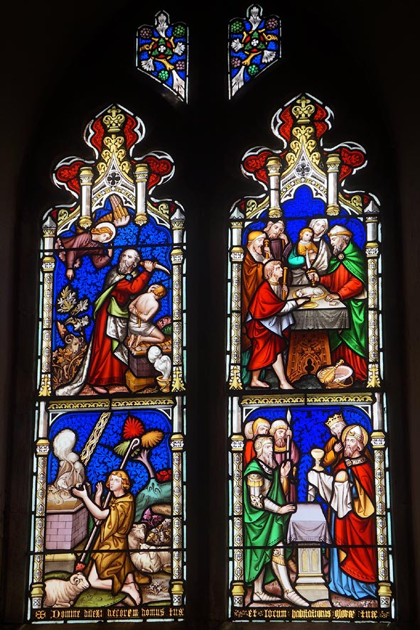 Stained glass; Abraham and Isaac, sacrifice of a lamb, Passover, Eucharist, by William Wailes.