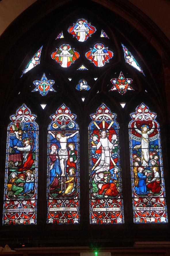 Stained glass; in the Garden of Gethsemane, the Crucifixion, the Transfiguration of Christ, the Ascension, by John Hardman.
