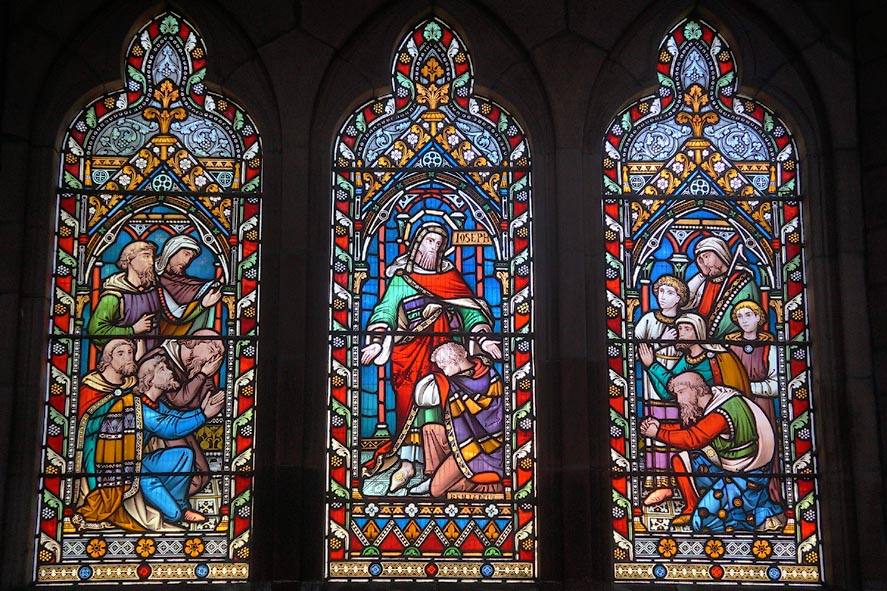 Stained glass; Joseph receiving his brothers, by William Wailes.