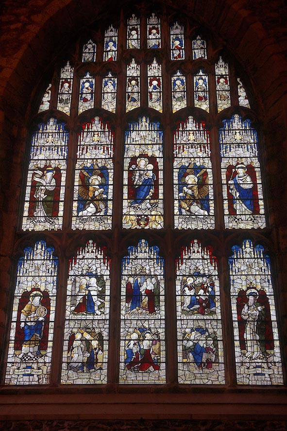 Stained glass; the Blessed Virgin Mary, etc etc, by Burlison and Grylls.