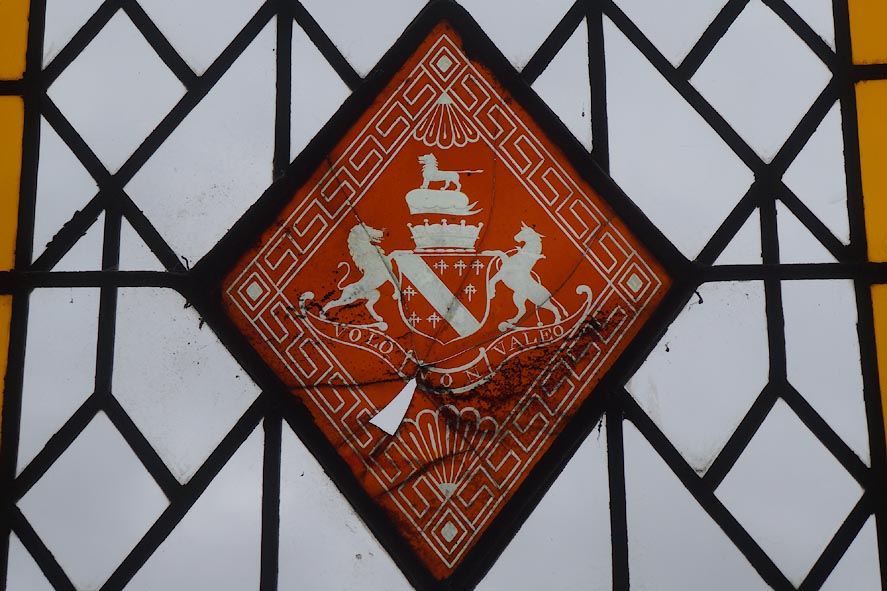 Stained glass; east window, coat of arms, Howard Family, motto:-