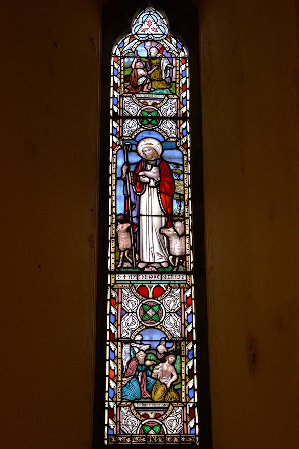 Stained glass; The Prodigal Son, Christ the Good Shepherd, The Good Samaritan; by Wailes and Strang.