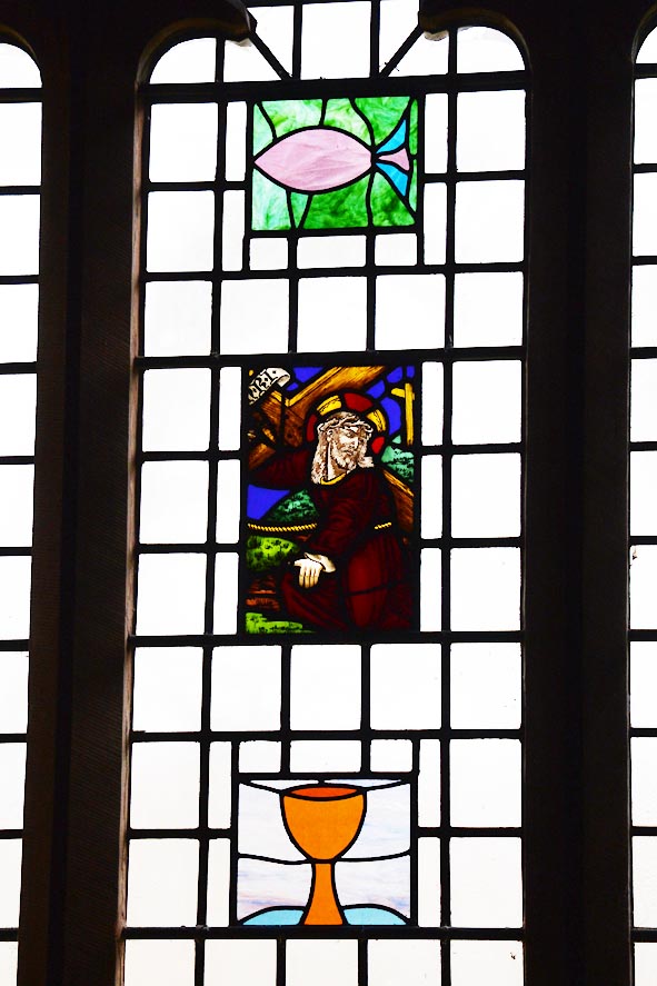 Stained glass, east window; the fish, Christ carrying the Cross, a chalice.