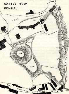 by Richard Gough, published London, 1789. goto sourcePage 152:- "... opposite to it [Kendal Castle] is a large exploratory mount called Castlehow hill; whether Roman or not is uncertain: it is flat at top, surrounded by a ditch crossed by another. Round the base a deep foss and high dike strengthened by two bastions on the east side. Dr. Stukeley calls it Saxon. Immediately below it is a spot called Battle place. ..." |