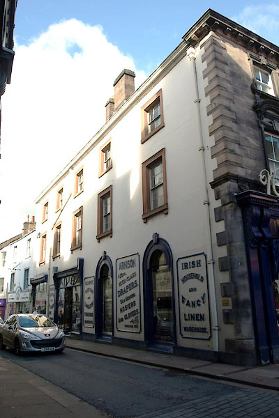 | source data:- | courtesy of English Heritage "C18 and later. Painted ashlar with rusticated quoins and top cornice. Three storeys. A plaque states that the grandparents of William and Dorothy Wordsworth lived here. The facade, at least, has been rebuilt. Present draper's shop established here 1742. Now has elaborate Victorian shop fronts on west and south, with narrow colonnets, glazed scrolled friezes, some round arched moulded windows with triple keystones, and panels of raised lettering, "drapers, silk mercers, hosiers, glovers etc." Two upper storeys have sash windows (5 on west, 3 on south, and 2 on east facade, on each floor). Interior has iron columns, and iron balusters to staircase, shop fittings of mahogany with dentilled cornices." |