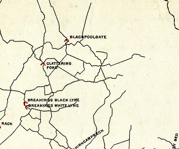Thurnam and Sons, Carlisle, Cumberland, 1892.![]() BEL9NY57.jpg "CLATTERING FORD" bridge symbol Road map of Cumberland showing County Bridges item:- Carlisle Library : Map 38 Image © Carlisle Library |
