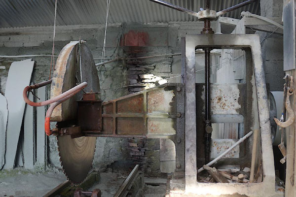 A large circular saw, diamond saw blade, is used for cutting slabs. |