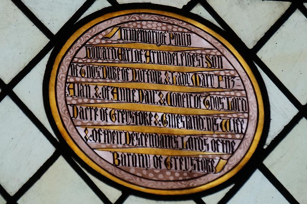 | St Andrew, Greystoke: stained glass - coats of arms | ||