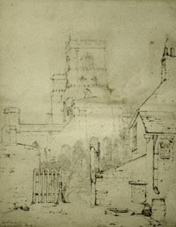 1835? click to enlargePR1224.jpg Detailed sketch of a walled approach to the cathedral. To left stands a building adjoining West Walls; to right, a tall stone wall with two gates in it and outbuildings attached. A double gate stands open at the far end of the approach with a view through to the cathedral close proper. To right, a substantial sandstone building partially obscures the view of the cathedral, the tower of which is visible to extreme right of composition. inscribed at bottom right:- "In the Abbey" item:- Tullie House Museum : 1978.108.75.17 Image © Tullie House Museum |