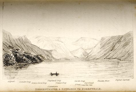 London, about 1836. click to enlargeTAT120.jpg The print is captioned with mountain names and acts as an outline view. Tipped in opposite p.60 of The Lakes of England, by George Tattersall. printed at bottom:- "DERWENTWATER &ENTRANCE TO BORROWDALE." printed at bottom left to right:- "Ashness. / Gowder Crag. / Hollow Stone Crag. / Glaramara. / Shepherd's Crag. / Grange Crag. / Castle Crag. / Gt. End. / Scawfell Pike. / Maiden Moor. / Higher Catbell." item:- Armitt Library : A1204.21 Image © see bottom of page |