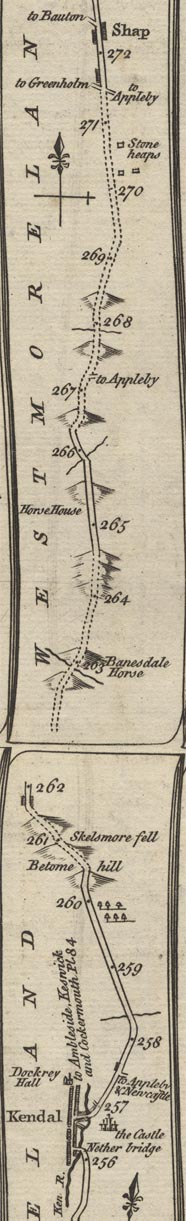 and Cumberland, by J Baker, London 1802. pp.25-26:- "[Kendal] ... another [street] leads by similar distance [half a mile] to cross the river Kent on the eastward, and by means of this latter the post road is continued to Shap. ..." "..." "The road from Kendal to Shap, after passing the fertile vale of the river Ken, shews a vast succession of wide wastes, mountains, and moors, long vales, and broad hollows, that yield the traveller little amusement after the novelty of the first impression. Seats of the Wakefield's and the Blount's adorn the first part of this track." |