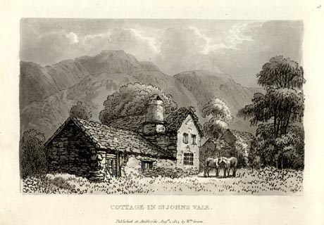 and Wythburn, Cumberland, by William Green, Ambleside, Westmorland, 1814. click to enlargeGN0928.jpg S of Sosgill Bridge; unidentified. Plate 28 in Sixty Small Prints. printed at top right:- "28" printed at bottom:- "COTTAGE IN ST JOHN'S VALE. / Published at Ambleside Augst. 1, 1814, by Wm. Green." item:- Armitt Library : A6656.28 Image © see bottom of page |