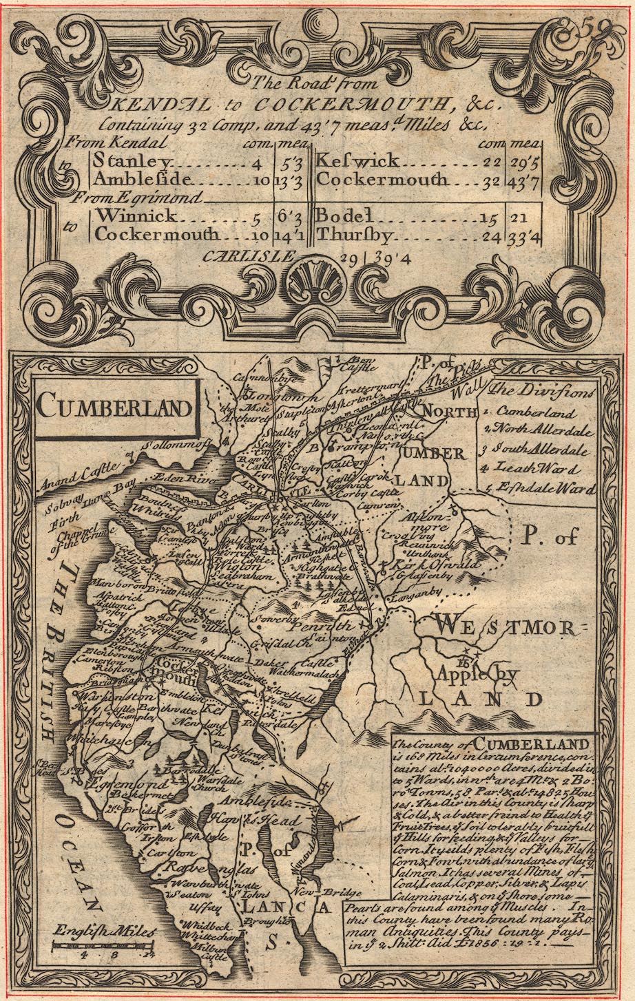 Map, uncoloured engraving, pl.259, Cumberland, scale about 16.5 miles to 1 inch, published by Emanuel Bowen, St Katherines, London, 1720.