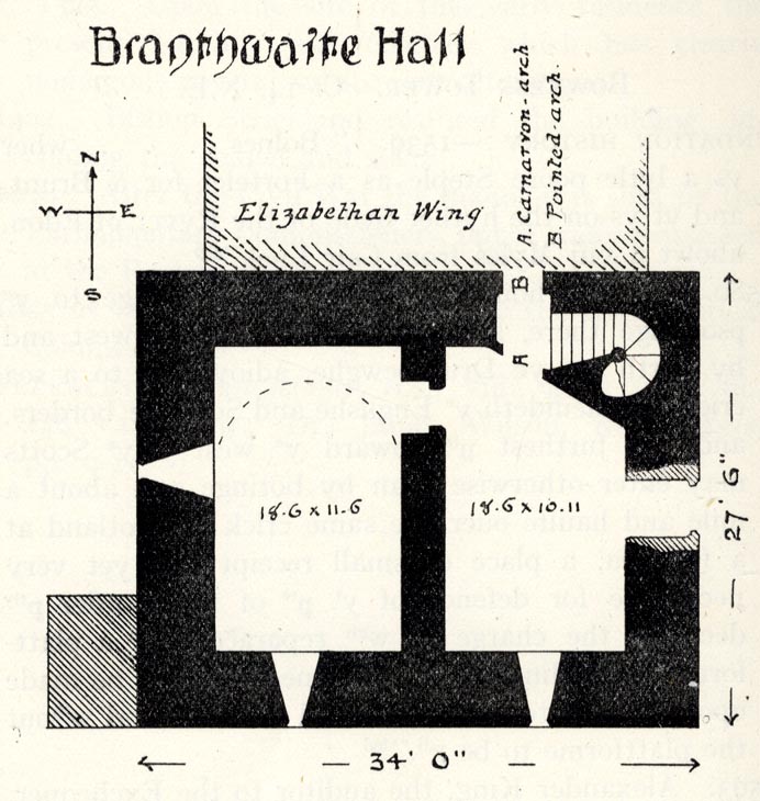 Site plan, lithograph, Branthwaite Hall, pele tower,