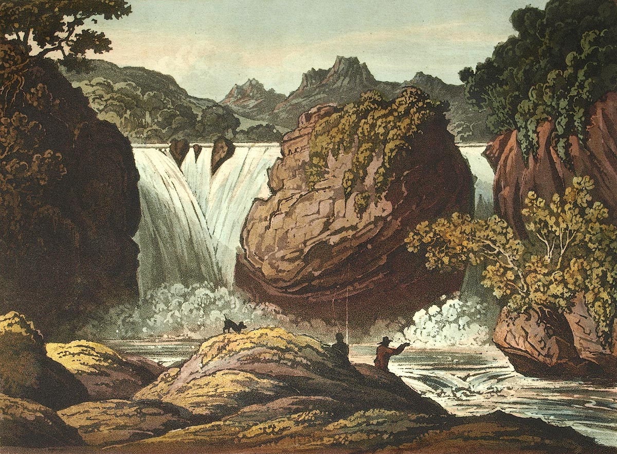 Print, coloured aquatint, Skelwith Force, Lancashire, drawn by Theodore H A Fielding, published by R Ackermann, 101 Strand, London, 1821.