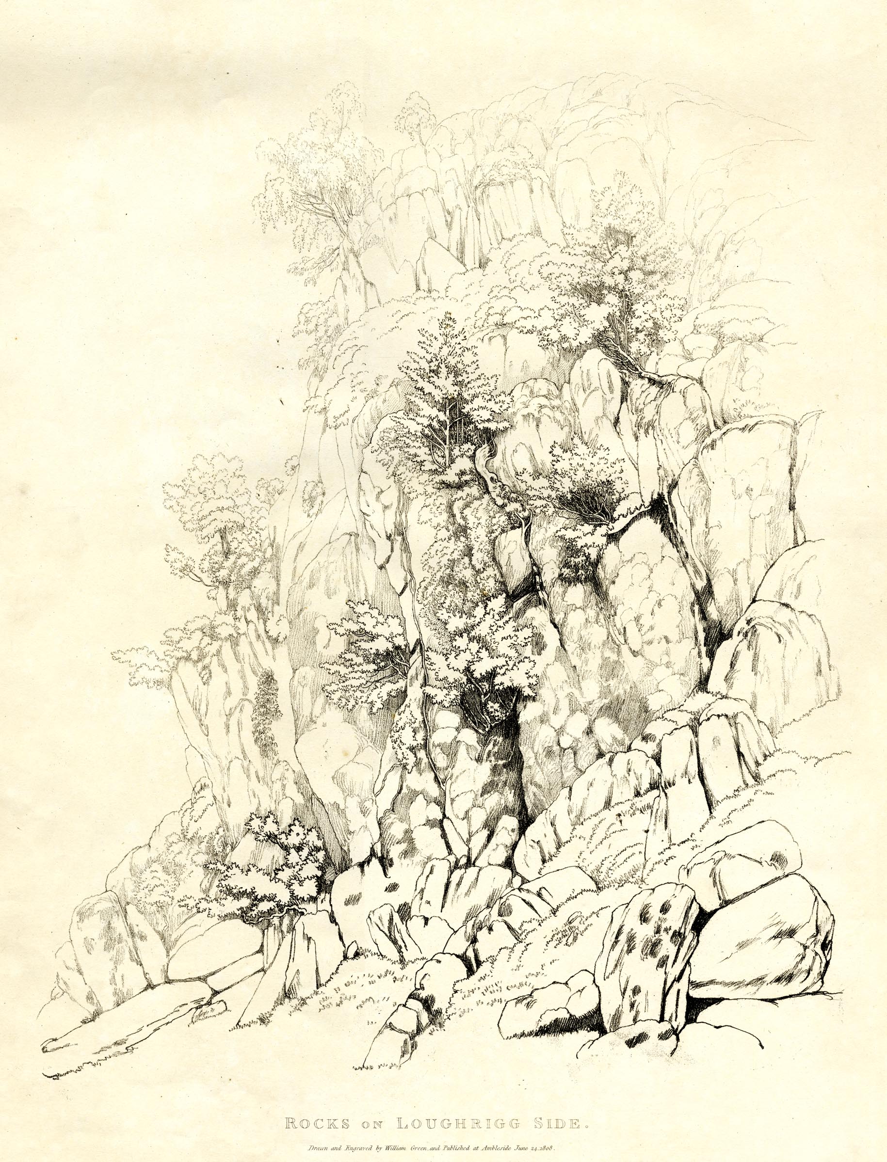 Print, soft ground etching, Rocks on Loughrigg Side, Loughrigg, Westmorland, by William Green, Ambleside, Westmorland, 1808.