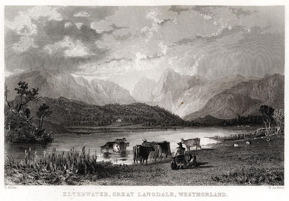 Print, engraving, Elterwater, Great Langdale, Westmorland, by Thomas Allom, engraved by le Petit, 1833.