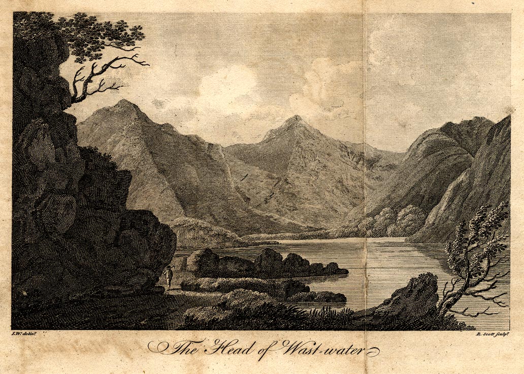 Print, uncoloured engraving, The Head of Wastwater, drawn by IW, engraved by R Scott, published by F Jollie, Carlisle, Cumberland, 1800.