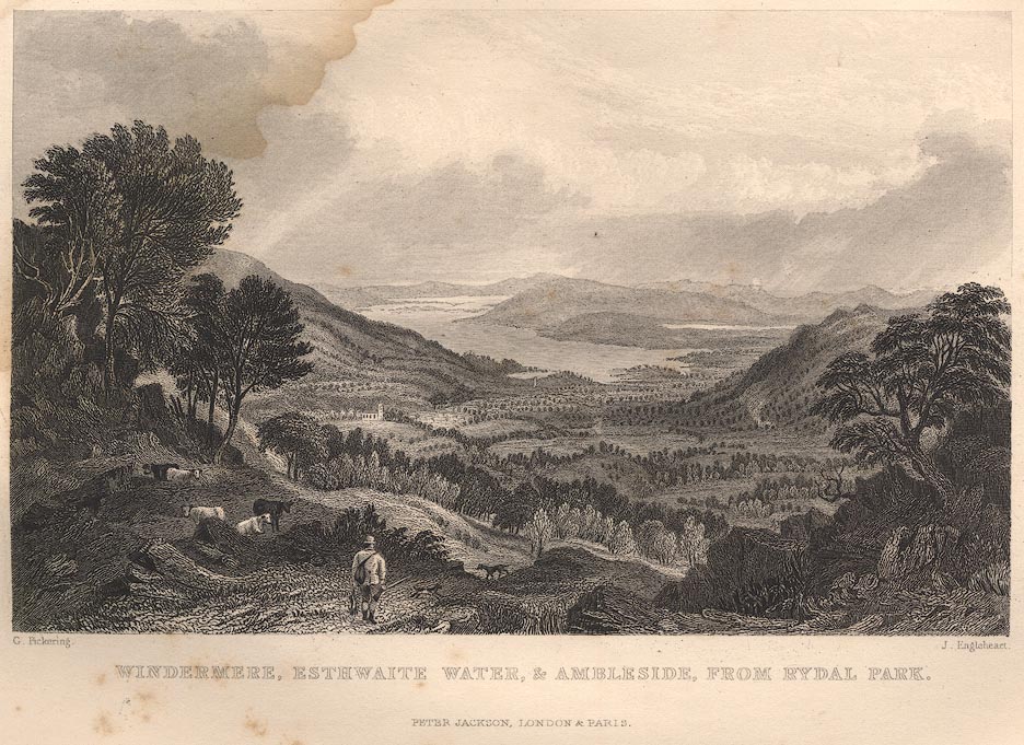 Print, engraving, Windermere, Esthwaite Water and Ambleside from Rydal Park, by George Pickering, engraved by J Engleheart, 1835.