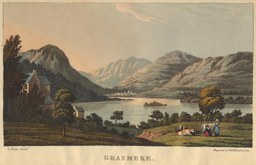 Print, hand coloured engraving, Grasmere, Lakes, Westmorland, drawn by I Feary, engraved by Robert Havell and Son.