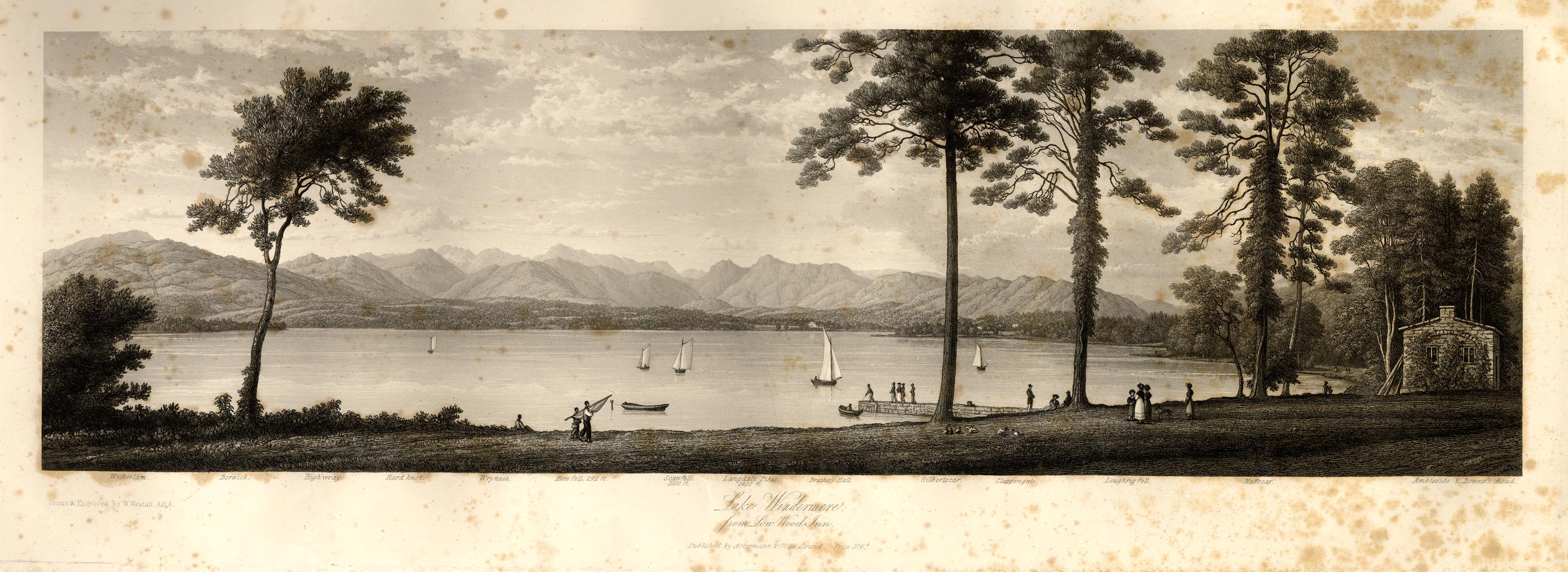 Print, aquatint panorama, Lake Windermere, from Low Wood Inn, Westmorland, drawn and