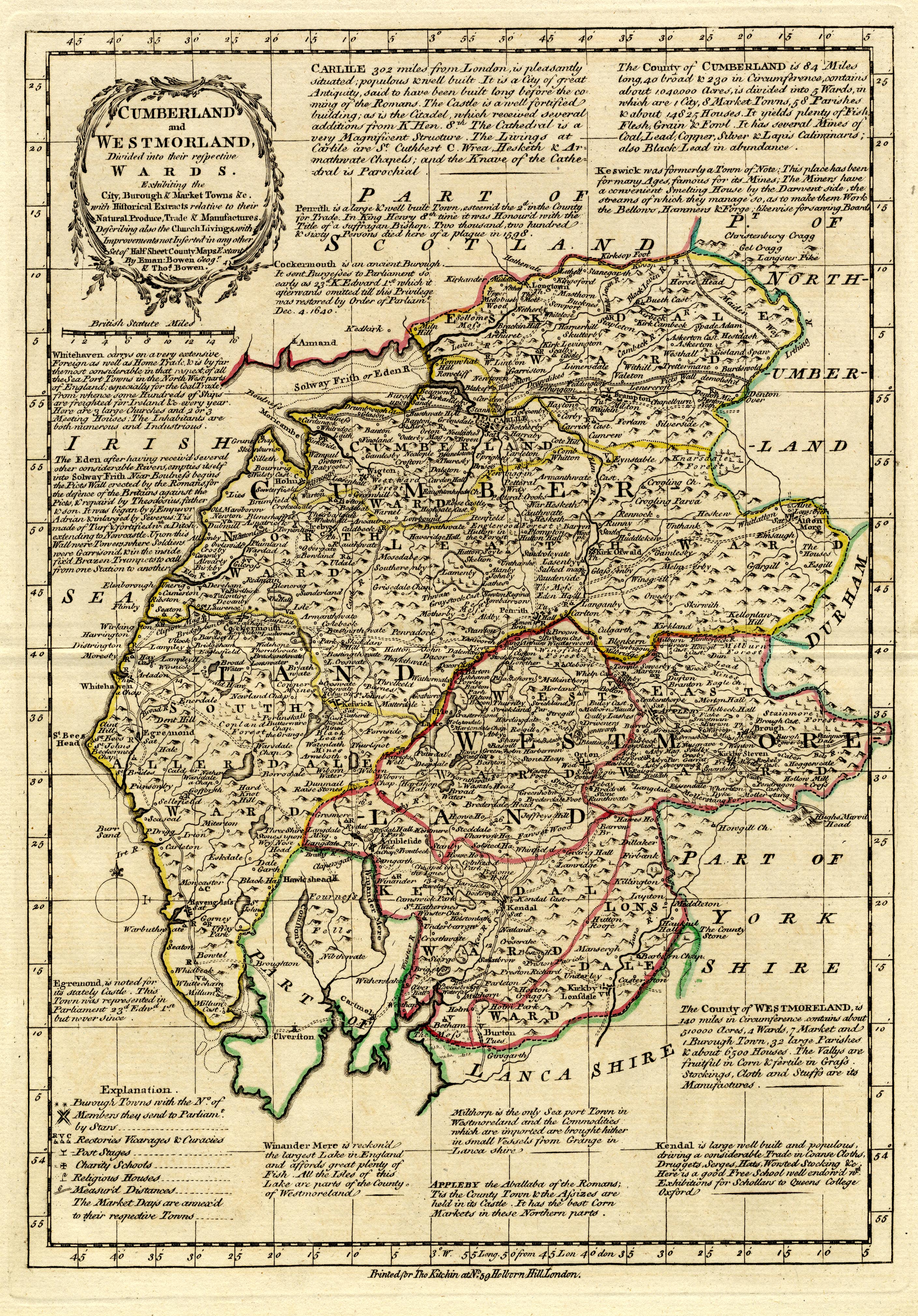 Map, hand coloured engraving, Cumberland and Westmorland, scale