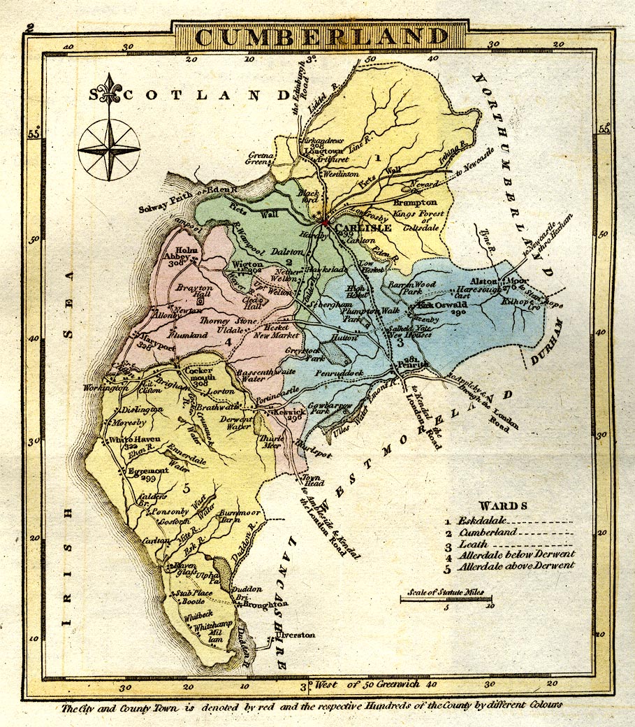 Map, hand coloured engraving, Cumberland, scale about 15.5 miles