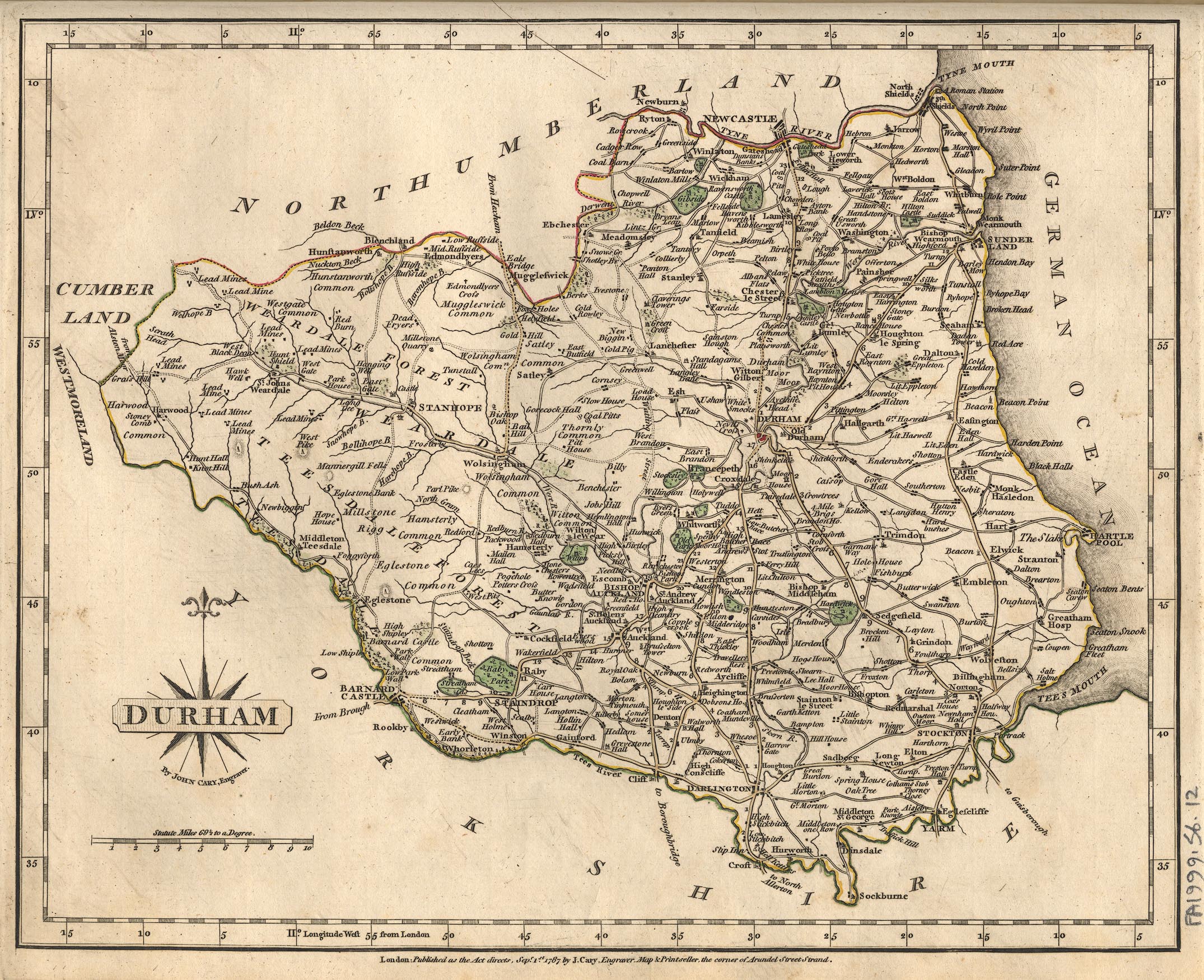 Map, hand coloured engraving, Durham, scale about 5 miles to 1 inch, by John Cary, 188 Strand, London, 1787.