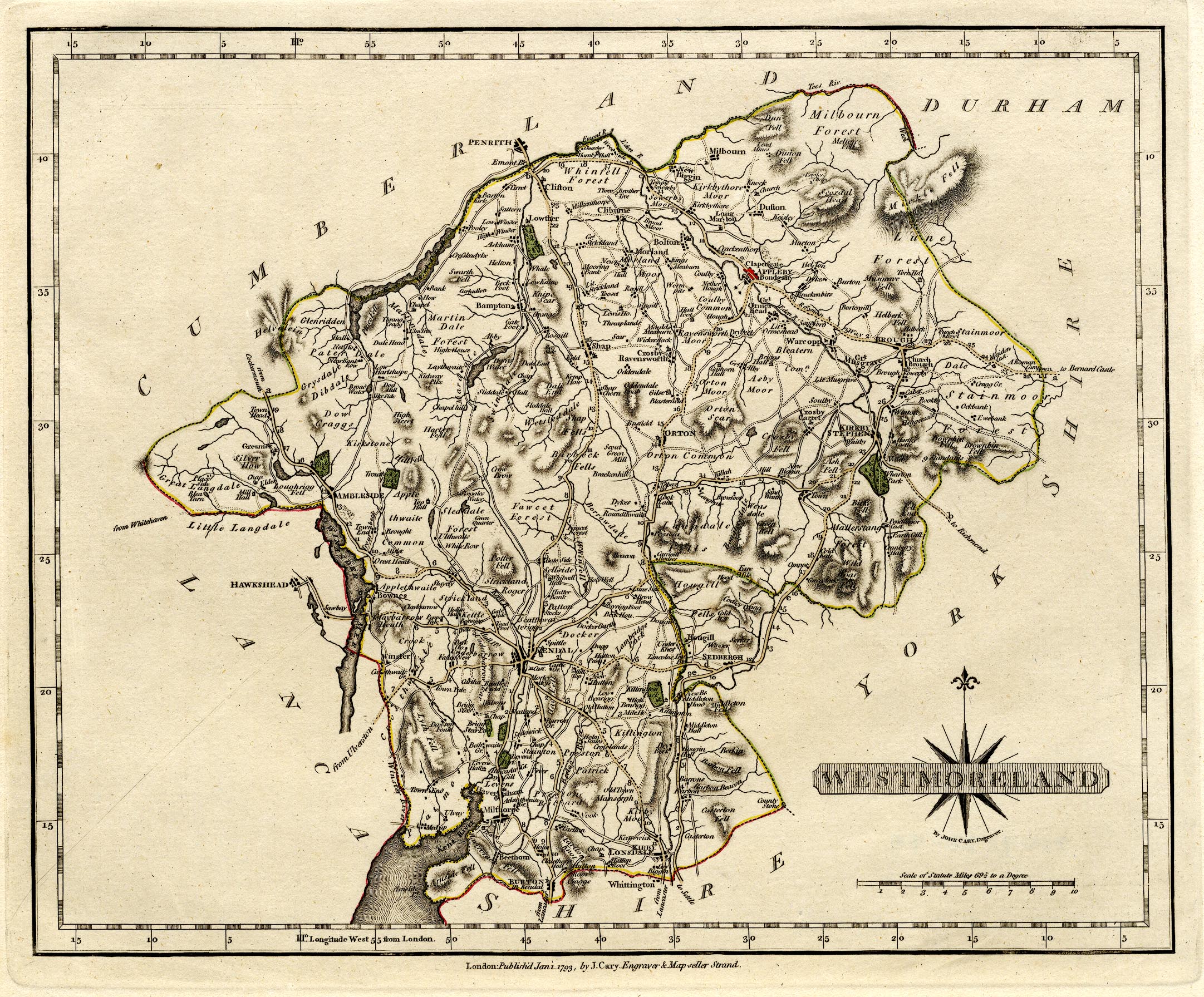 Map, uncoloured engraving, Westmoreland ie Westmorland, scale about 5 miles to 1 inch, by John Cary, Strand, London, 1793.