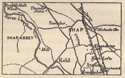 Map, engraving, Shap Abbey, Shap Rural, Westmorland, about 1884.