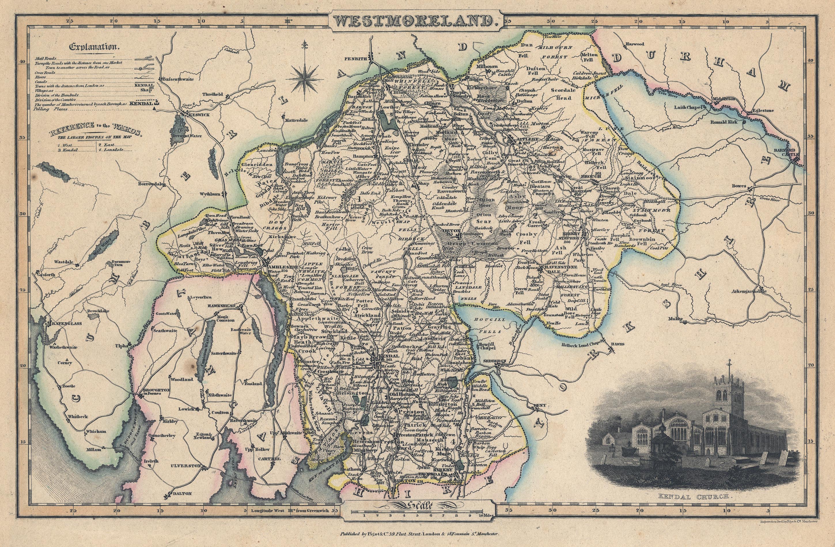 Map, Westmoreland ie Westmorland, scale about 4.5 miles to 1 inch, by James Pigot and Co, Basing Lane, London, 1826-27.