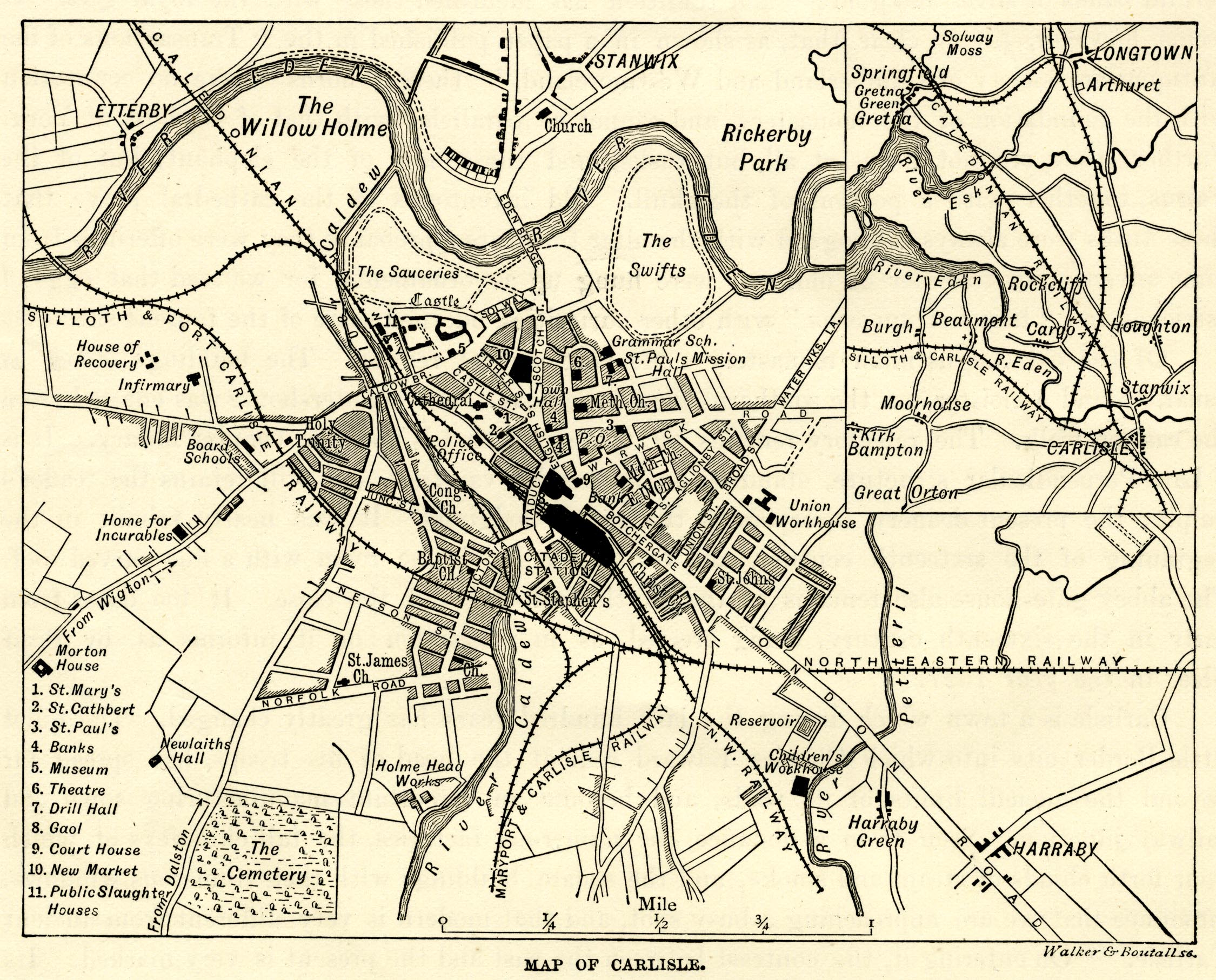 Town plan, uncoloured engraving, Map of Carlisle, Cumberland, scale about 2 inches to 1 mile, engraved by Walker and Boutall, published 1900s?