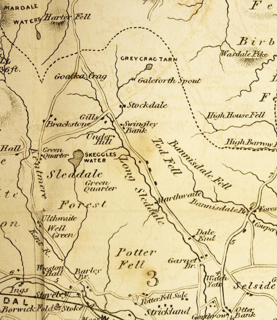 Notes about Longsleddale from a Map of the County of Westmorland, scale about 2.5 miles to 1 inch, in Sayer's History of Westmorland, published by W Sayer, Kendal, Westmorland, 1847.